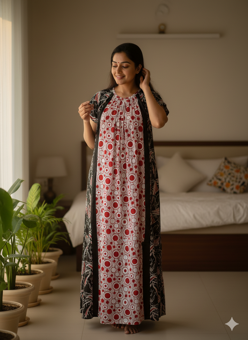 All nighties are made from 100% pure cotton, soft on skin, breathable, and perfect for all-season comfort.