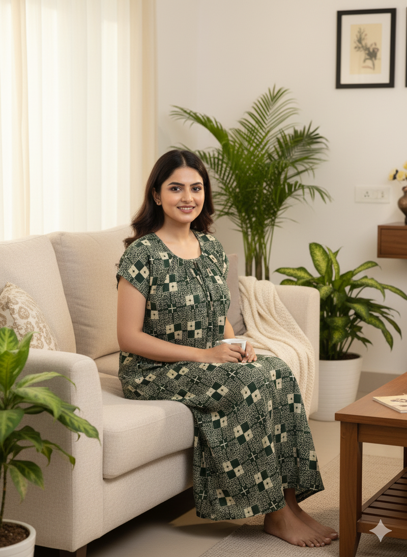 Our free-size cotton nighties are designed to comfortably fit most body types. Generally, they fit up to Bust 44–46 inches and a length of 52–54 inches (ankle length).